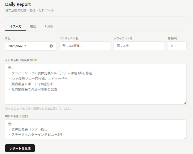 コンサルタント向けの日次レポート自動整形ツール。要するに「今日やったことをざっくり箇条書きで入れると、Claudeがちゃんとした報告書っぽくまとめてくれる」というやつだ。だれもが作っている気がするけれども。