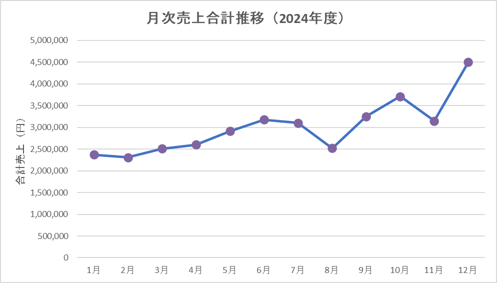 🟡 12月への売上集中リスク 12月売上450万円は年間の12.5%、月平均の1.5倍。年末需要への過度な依存は変動リスクになるという指摘。
