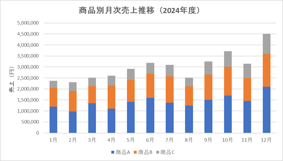 「Sheet1のA列(月)とB〜D列(商品A・B・C)を使って、月別の商品別売上を積み上げ棒グラフにして。タイトルは『商品別月次売上推移(2024年度)』にしてください」