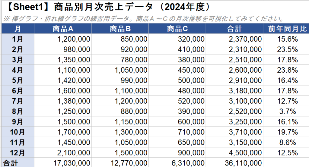 Sheet1「商品別売上」。商品A・B・Cの月次売上12ヶ月分と、合計・前年同月比が入ったシンプルな構成です。以下シートの内容です。