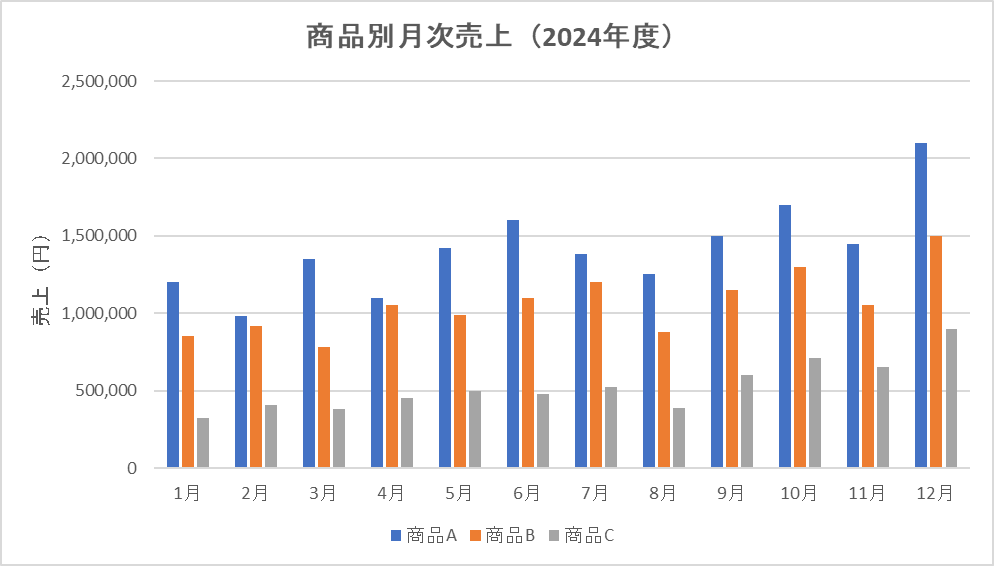 返ってきたのは商品A・B・Cを月別に並べた棒グラフ1枚。タイトルも「商品別月次売上(2024年度)」と自動でついていました。